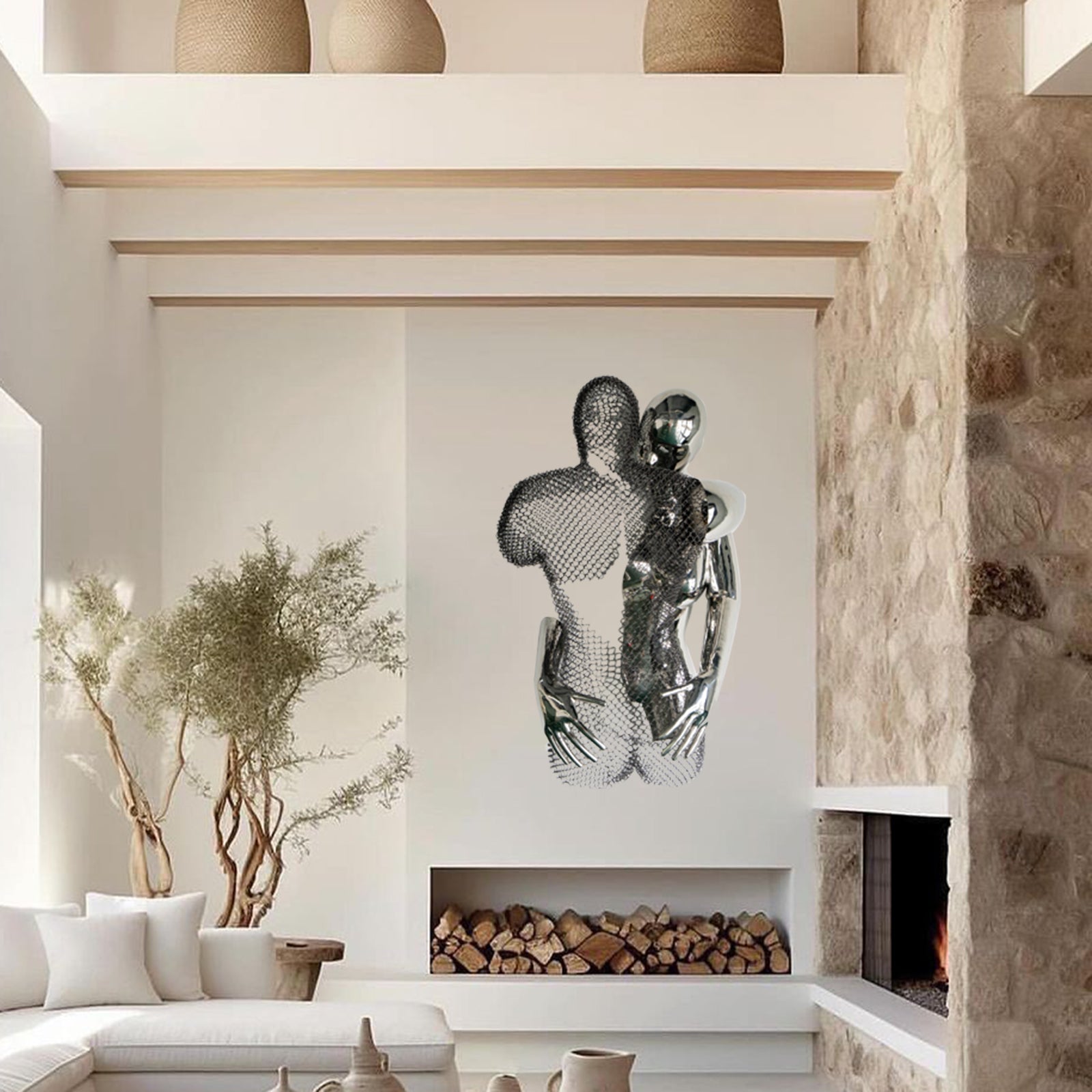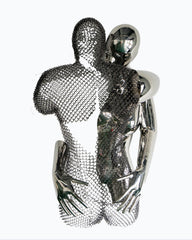 The sculpture features two human figures entwined in a close embrace. One figure is fully realized in polished stainless steel, reflecting light and surroundings with a mirror-like finish that adds to its dynamic presence. This figure’s smooth and highly reflective surface symbolizes the solidity and permanence of their connection.