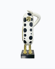 The sculpture features a whimsical cartoon bird character, characterized by its playful proportions and exaggerated features. The bird is painted in a striking white with black polka dots, adding a fun and modern touch. The beak, legs, and feet are finished in a polished gold tone, contrasting beautifully with the monochromatic body. Its expressive pose, with one wing raised as if waving, adds a sense of movement and charm.