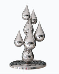 The sculpture features seven small water drops arranged in a cascading formation. Each drop is perfectly symmetrical and smoothly contoured, creating a harmonious and visually pleasing composition. The reflective surface of the stainless steel adds a dynamic element, allowing the sculpture to interact with the surrounding light and environment.