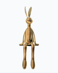 Stainless Steel Gold Rabbit Sculpture, designed to bring a touch of whimsy and modern elegance to any interior space. Standing at 480 mm tall, this sculpture features a delightful rabbit figure with elongated ears and a minimalist, stylized form. The rabbit is depicted in a relaxed, seated position, with its legs dangling over the edge, adding a playful and endearing element to your decor.