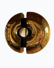 The symmetrical split design adds a dynamic, futuristic edge, while the central circular mirror reflects its environment—enhancing depth and visual intrigue.